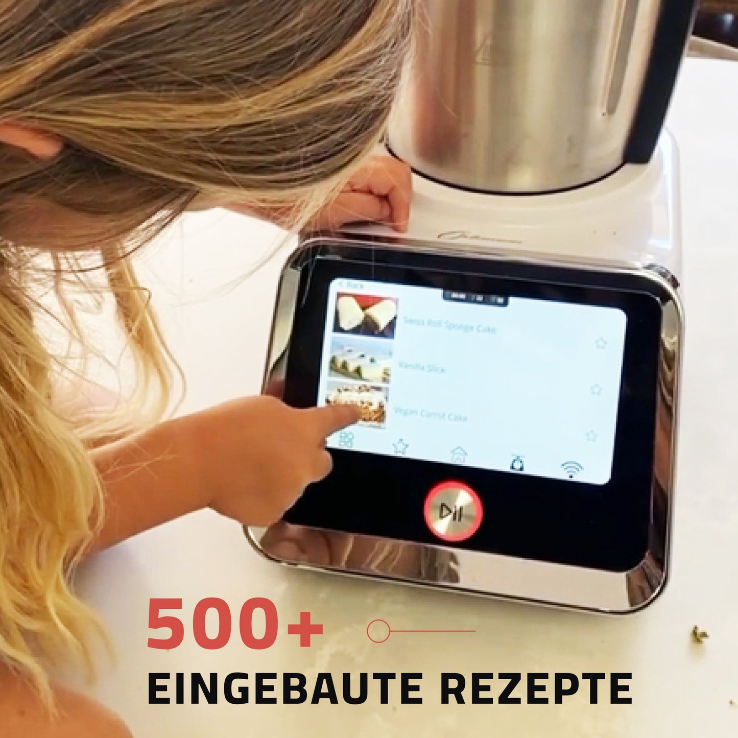 | Speciale programma's | Groot digitaal LCD-scherm voor handmatige instelling van tijd, temperatuur en snelheid. 5 vooraf ingestelde programma's voor jam, stomen, soepen en 2 deegkneedprogramma's. Linksdraaiend (achteruit), geïntegreerde recepten, WIFI en de mogelijkheid om eigen recepten op te slaan en te programmeren in een mobiele app - voor meer flexibiliteit. |