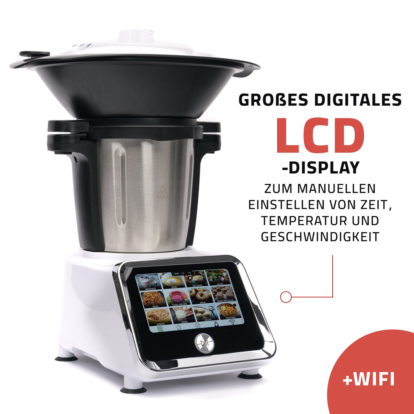 Groot digitaal LCD-display voor handmatige invoer van tijd, temperatuur en snelheid. 5 vooraf ingestelde programma's voor het koken van jam, stomen, voor soepen en 2 deegkneedprogramma's. Linksdraaiend (achteruit), voorgeprogrammeerde recepten, WIFI en de optie om uw eigen recepten in een mobiele app op te slaan voor meer flexibiliteit.