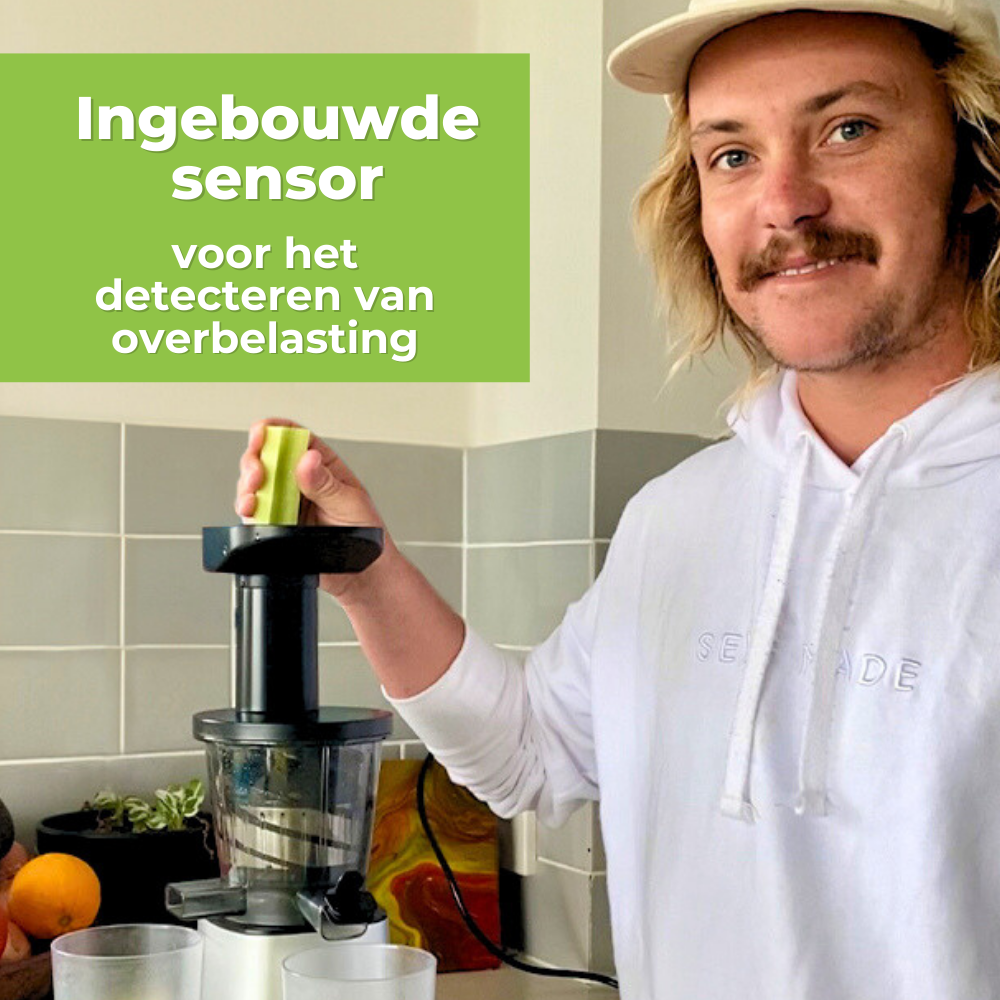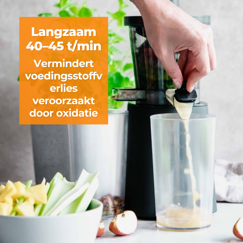 MAXIMALISEER JE SAP: Lage snelheid van 40-45 tpm voor ultiem behoud van voedingsstoffen + 10% - 20% meer sap en minder pulp dan bij alle andere sapcentrifuges
