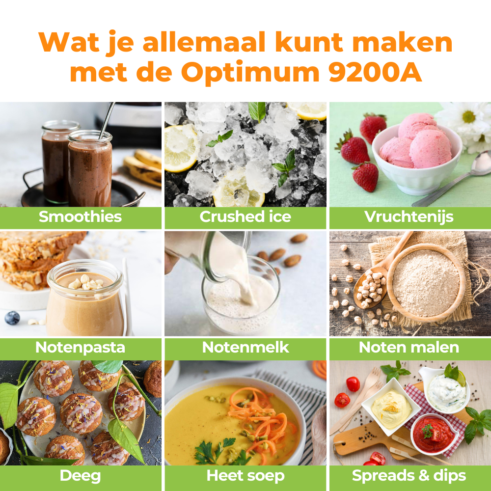 - De Optimum 9200A (2e generatie) is een geheime aanrader vergeleken met gangbare alternatieven op de markt. Ik was erg kritisch en heb veel vergelijkende tests gelezen en bekeken en ben erg blij dat ik voor dit apparaat heb gekozen. De klantenservice is uitstekend. De Optimum 9200A (2e generatie) in een donkerrood ziet er zeer elegant uit en past onder de keukenkastjes. Het apparaat is eenvoudig te bedienen en doet wat het belooft. Voor mij was de ultieme test het maken van pindakaas en dat lukt het apparaat moeiteloos. Ook het malen van graan gaat uitstekend. Smoothies krijgen een uitstekende romigheid die ook na langere tijd staan behouden blijft. Mijn conclusie: wie iets voor zijn gezondheid wil doen en zelf eigen voedsel wil verwerken, moet zeker in dit apparaat investeren en zal niet teleurgesteld zijn.