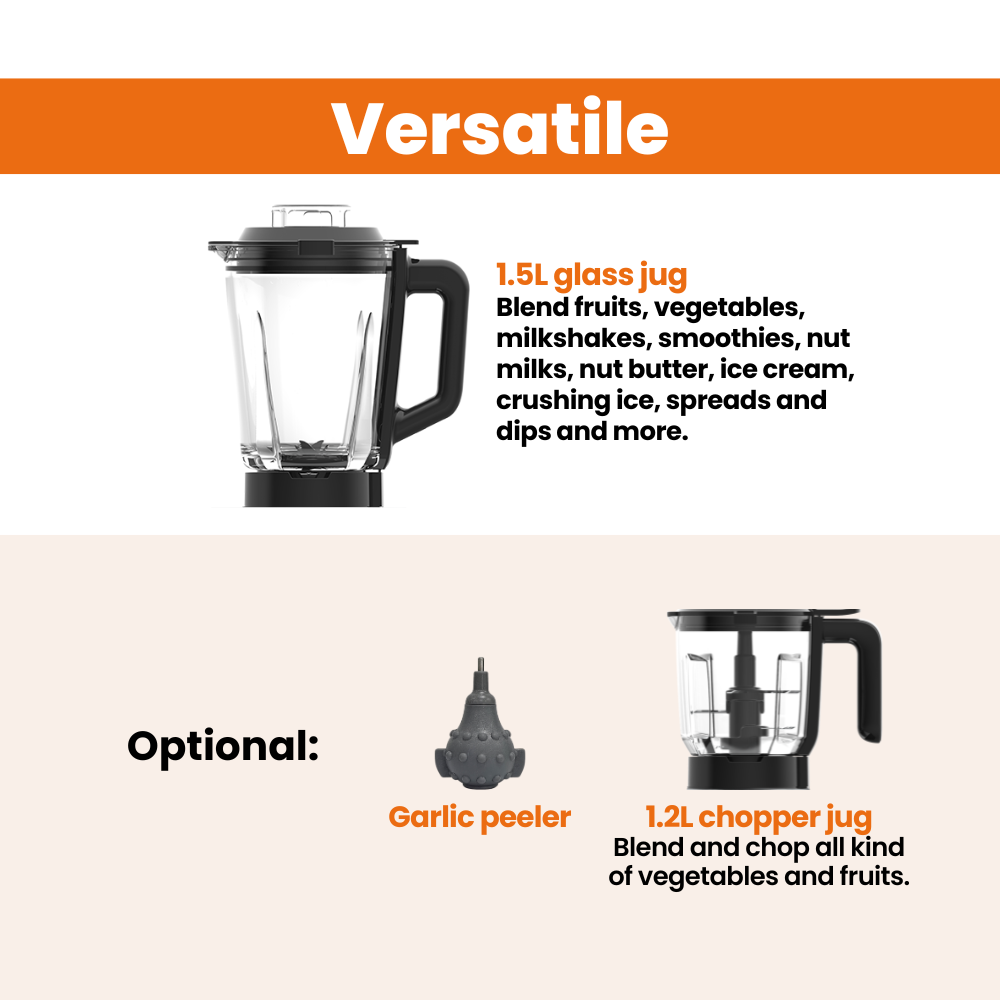 AANVULLENDE ACCESSOIRES: Wordt geleverd met een optionele 1,2L BPA-vrije kunststof foodprocessor (hakmolen) voor extra veelzijdigheid en een 1L roestvrijstalen kan voor malen en notenboter. Plus stamper voor glad blenden + knoflookpeller (optioneel).