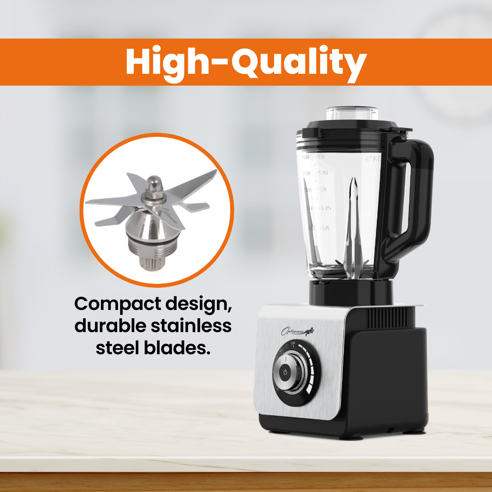 HOOGWAARDIG: Compact ontwerp. Duurzame roestvrijstalen mesassemblage voor grondig blenden en malen.